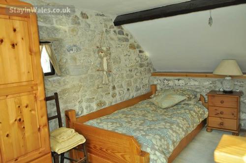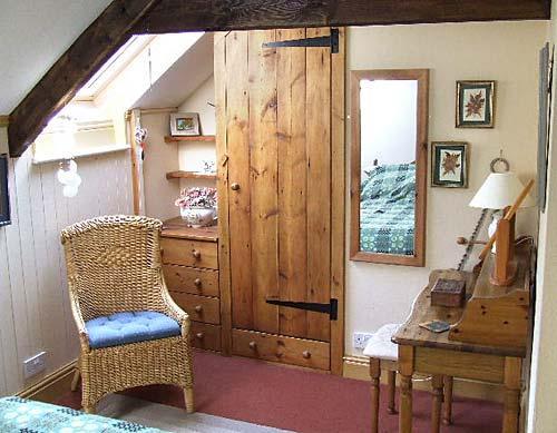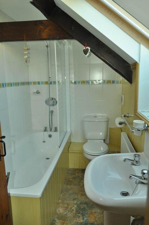 Steps lead down from the living room into the kitchen/diner which is well equipped with pine table and chairs, washing machine, dishwasher, gas cooker, microwave, fridge, freezer and tv/dvd combi. There is a fully equipped kitchen with ample units above and below. The kitchen/diner is divided by a peninsular unit. Off the entrance hall there is downstairs cloakroom with toilet and wash-hand basin. There is also an interconnecting door which is lockable from both sides to The Stable accommodation for two people. The wooden staircase leads to the upstairs bedrooms and bathroom. There is a single and a double bedroom with handmade fitted wooden wardrobes and drawers, low beams and Velux windows. The rooms are sympathetically decorated and furnished. The bathroom has a white suite with a shower over the bath and bathroom cabinet.