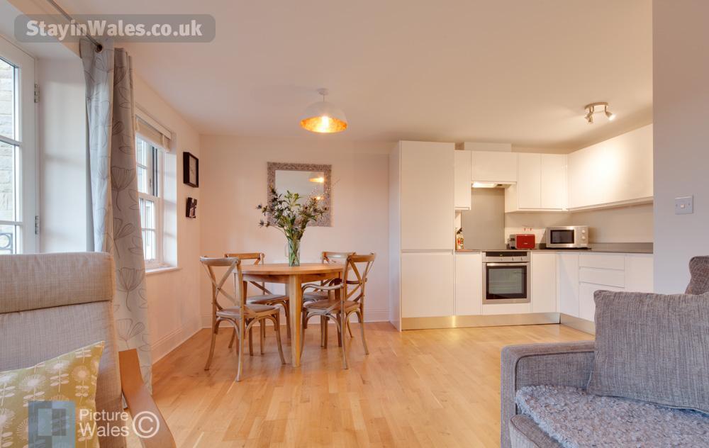The apartment has a spacious open-plan kitchen, living and dining area which opens onto the balcony, from where there are distant views along the Wye Valley. The kitchen is fully fitted and has a built-in electric oven, induction hob and fridge freezer. There's also a kettle, a toaster, and a good selection of cookware, crockery, cutlery and glasses.
