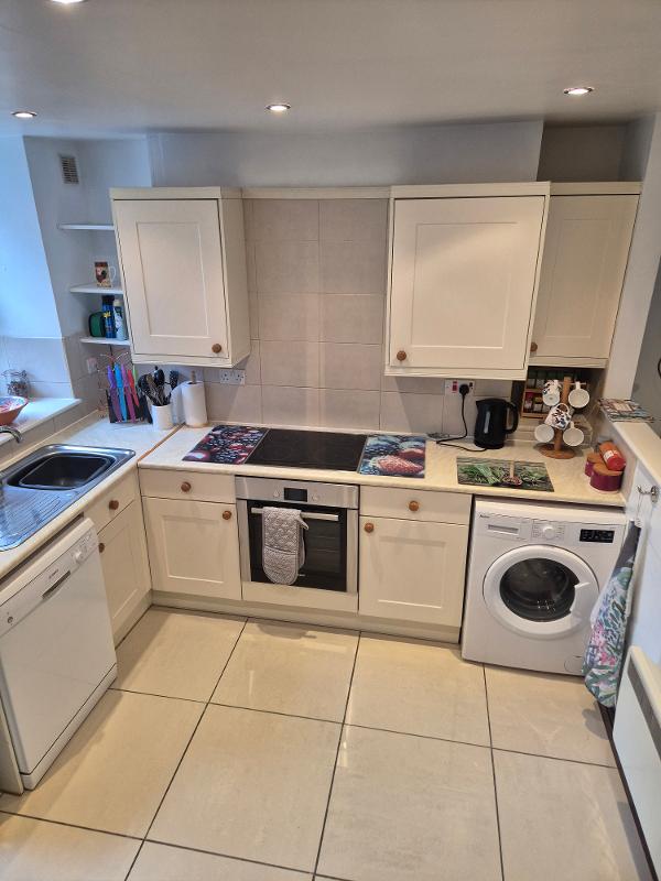 The lounge is furnished with two sofas, a tv with freesat and a DVD player. Heating is provided by electric radiators. The lounge goes through to an open plan kitchen area that is fully equipped with pots, pans, crockery, cutlery and other kitchen utensils. There is an electric oven and hob, dishwasher, fridge, washing machine, microwave, toaster, kettle and slow cooker. There is a fold down table with 4 seats.
