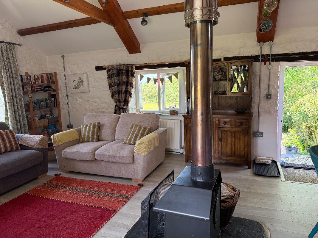 On entering you will find a vaulted, spacious living, kitchen and dining area with a wealth of beams and traditional features. There are two sofas and an armchair, flat screen tv with dvd and cd player. A wood burner in the centre gives character, being overlooked by the galleried bedroom.